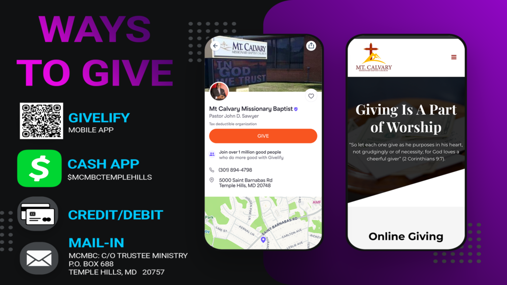 During every worship service, you will have an opportunity to give to MCMBC in person. Simply follow the direction of the presider and our ushers.